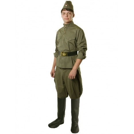 Комплектация: гимнастерка из бязи, брюки-галифе из бязи, пилотка из бязи с металлической звездой, ремень их кожзаменителя с металличекой пряжкой-звездой