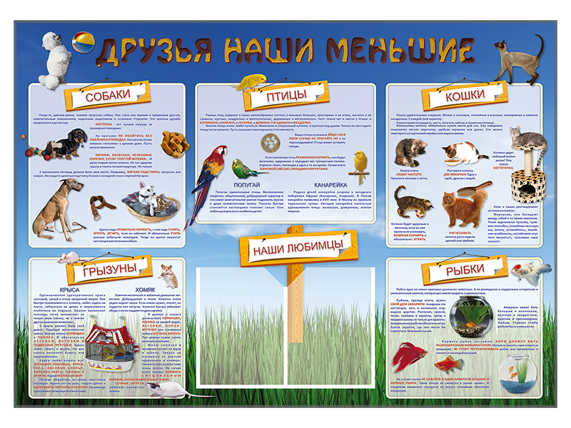 На стенде-уголке размещены рубрики: "Собаки", "Птицы", "Кошки", "Грызуны", "Рыбки" и "Наши любимцы".
