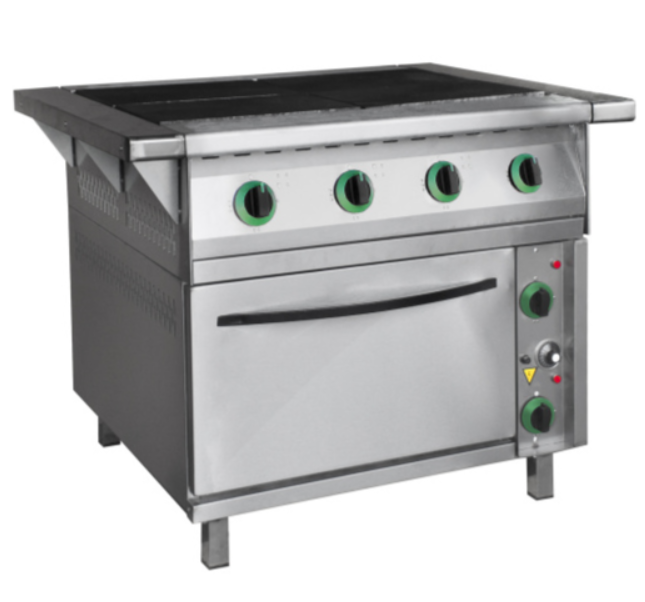 Плита оснащена четырьмя чугунными конфорками общей площадью 0,48 м2., размер каждой 417х295 мм., мощность одной конфорки 3 кВт., максимальная температура рабочей поверхности не более 480 градусов.
