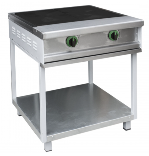 Плита оснащена двумя чугунными конфорками общей площадью 0,34 м2. Размеры конфорки 530х320 мм. Три ступени регулировки мощности конфорок.